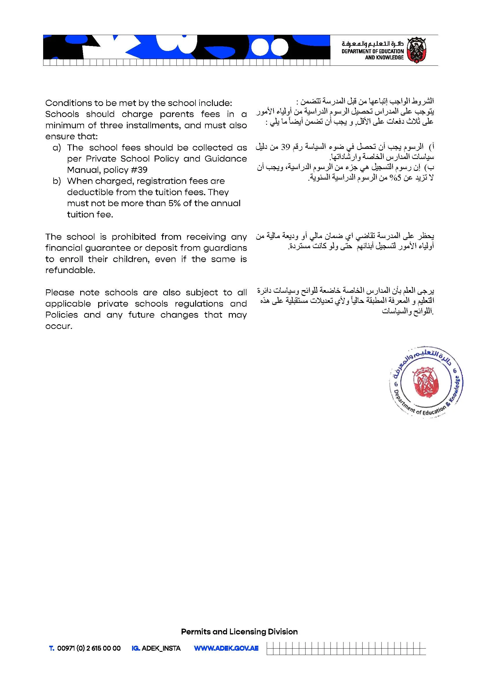 All fees must be paid in AED or UAE dirhams. In the case of foreign currency payments, they will be converted to the equivalent UAE dirham value on the day of payment.