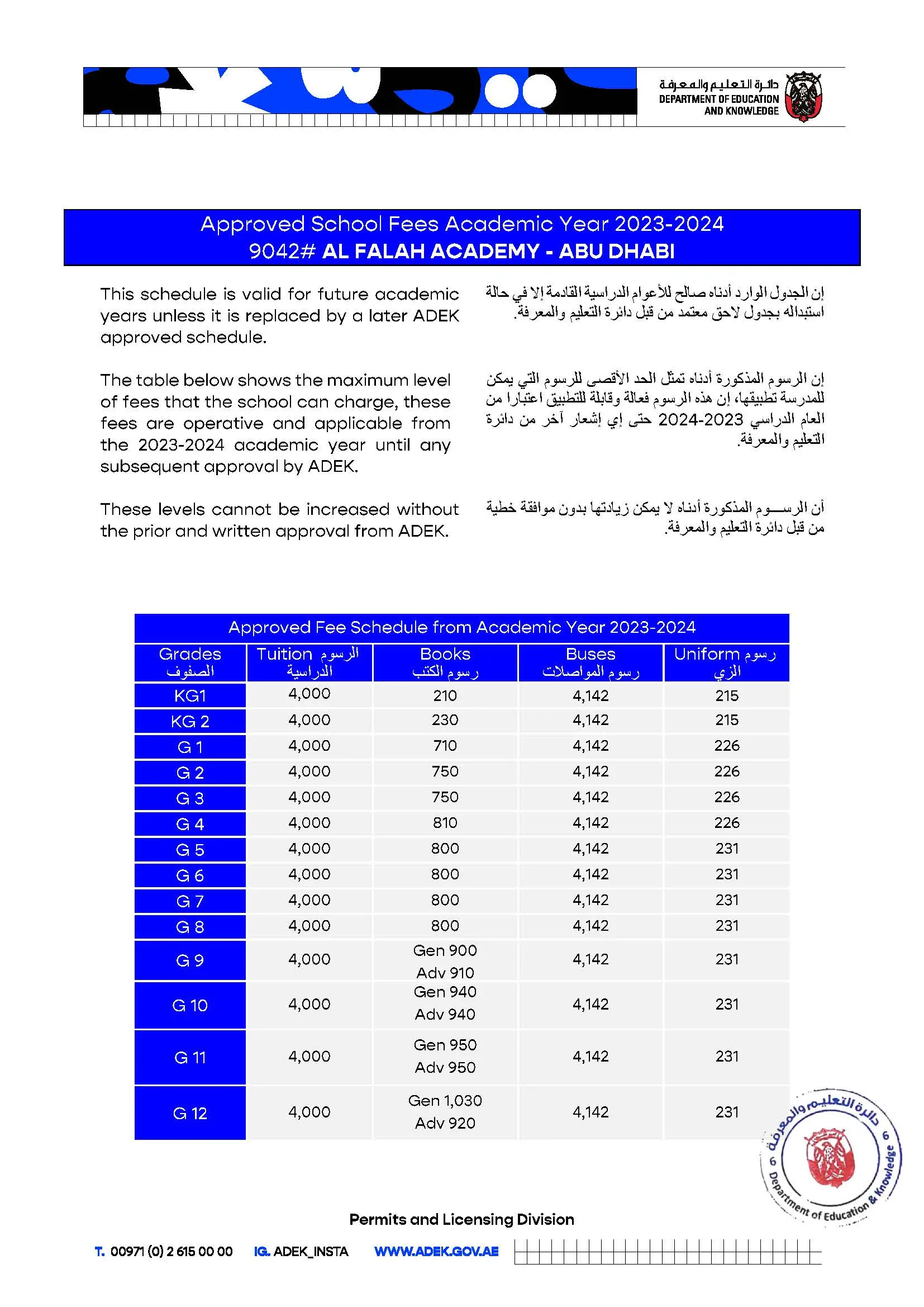 All fees must be paid in AED or UAE dirhams. In the case of foreign currency payments, they will be converted to the equivalent UAE dirham value on the day of payment.